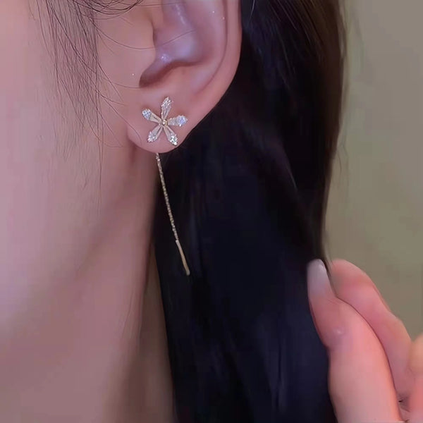 Delicate flower studs meet flowing tassels to create a timeless statement. Designed to be lightweight and comfortable, these earrings bring sparkle and sophistication to every occasion.